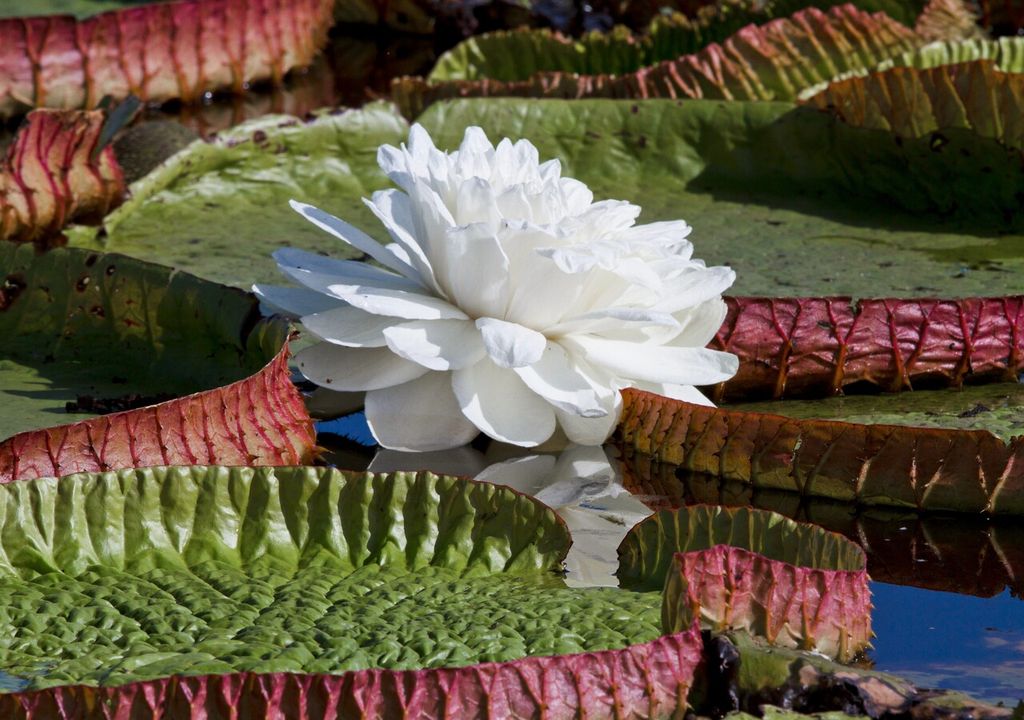 Ninfea gigante dell’Amazzonia (Victoria amazonica): regina indiscussa dei fiumi sudamericani, apre i suoi fiori solo di sera: la prima notte sono bianchi e femminili, la seconda notte diventano rosa e maschili, in un raffinato meccanismo che favorisce l’impollinazione incrociata. È un vero spettacolo della natura, tipico della regione amazzonica.