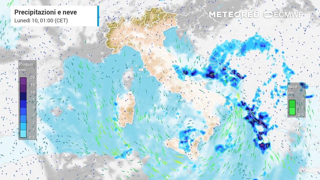 Anche la Puglia rischia di toccare i 100 millimetri complessivi di pioggia per effetto del doppio passaggio perturbato.