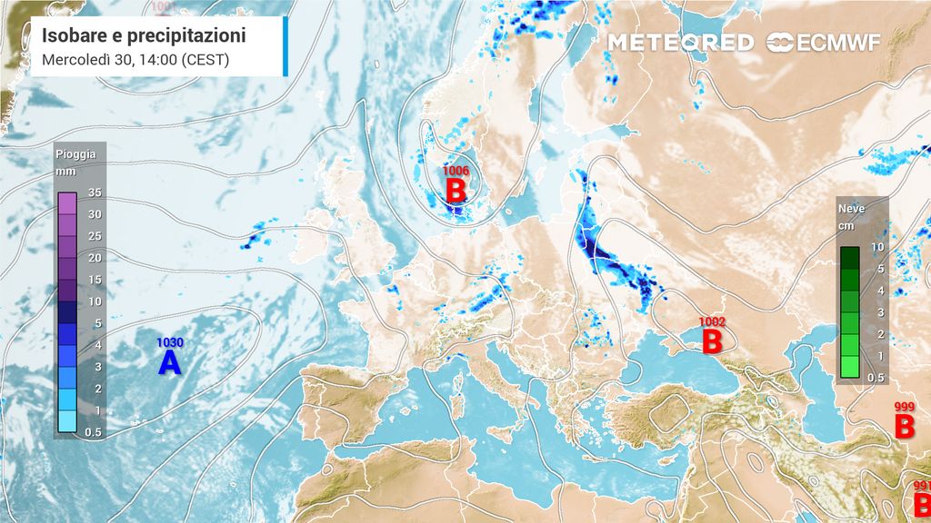 Il Sud Italia resterà più ai margini: qualche pioggia pomeridiana potrà interessare l’interno campano e la Puglia centro-settentrionale, mentre entro sera non si esclude qualche rovescio sulla Calabria.