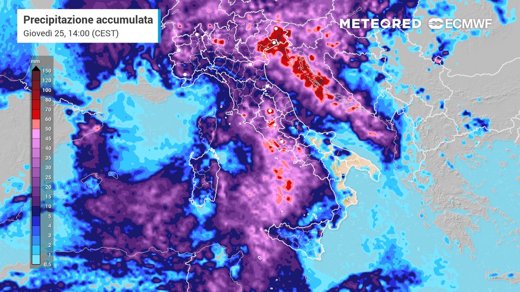 La giornata di giovedì vedrà una breve tregua dal maltempo, ma si tratterà solamente di una fase passeggera: già dalla serata/nottata tra giovedì 25 e venerdì 26, infatti, il maltempo tornerà ad intensificarsi.