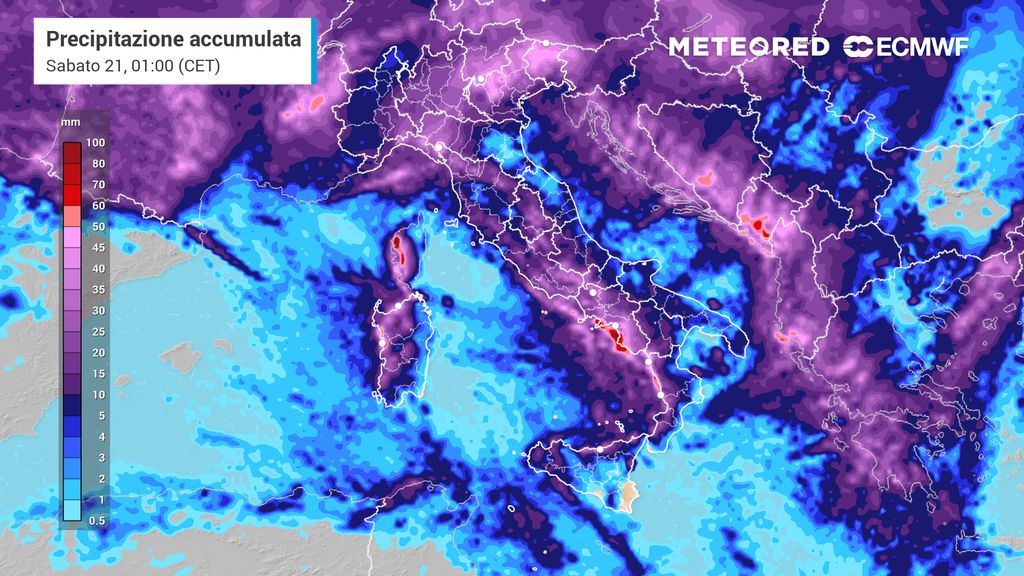 Le piogge potranno assumere carattere di forte intensità con accumuli significativi in poche ore tra levante Ligure e alta Toscana. Il modello europeo indica possibilità di accumuli superiori ai 50 mm in queste aree. Sono quantitativi importanti se si depositano al suolo in poco tempo, quindi attenzione.
