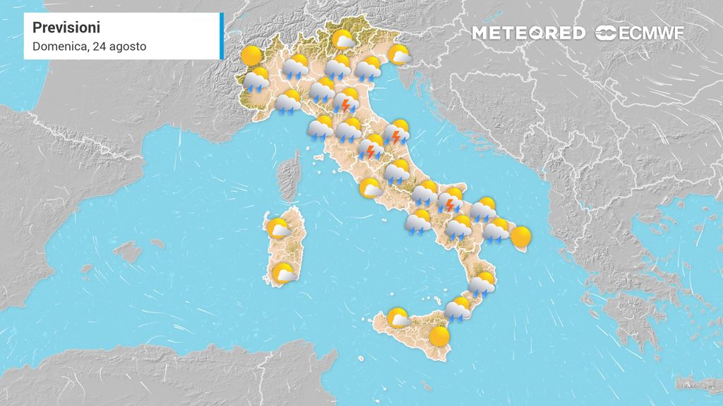 La parte peggiore dell'ondata di maltempo che ha colpito l'Italia nei giorni scorsi è passata, lasciando anche molti danni per allagamenti e caduta di alberi, ma il passaggio di una veloce perturbazione, nella giornata di sabato 23 agosto, determinerà nuovamente una fase di spiccata instabilità su parte del Paese, da Nord a Sud, favorendo lo sviluppo di precipitazioni a carattere sparso, generalmente a rapida evoluzione ma a prevalente carattere temporalesco.