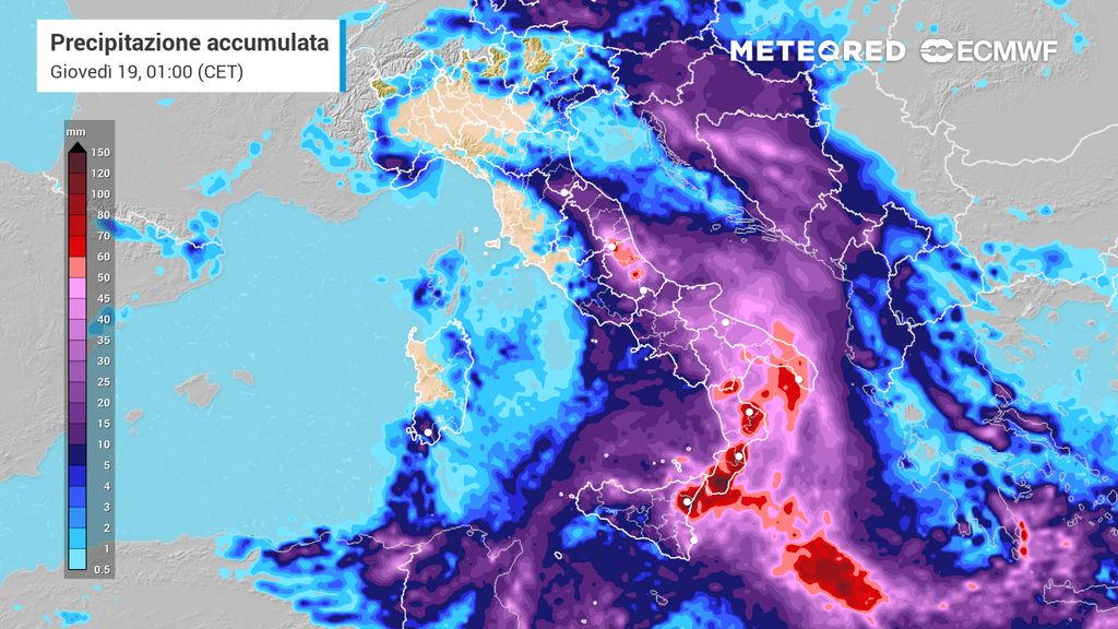 Il dato più preoccupante riguarda le piogge cumulate. Tra oggi e giovedì 19 marzo, nelle aree ioniche di Calabria e Sicilia gli accumuli potrebbero superare i 200-250 mm secondo il modello europeo. Tra martedì 17 e giovedì 19, si attendono picchi di 100 mm in Calabria.