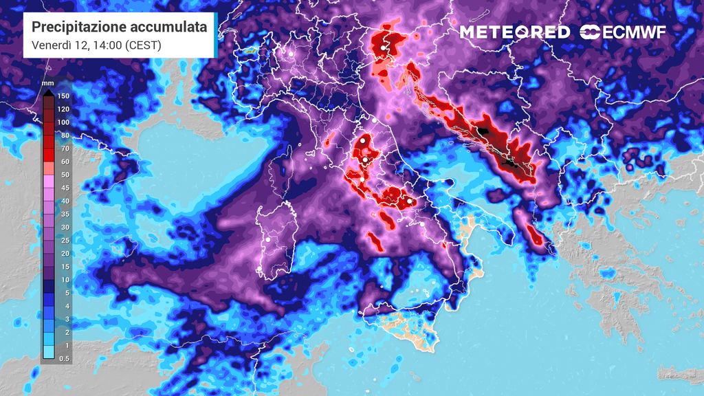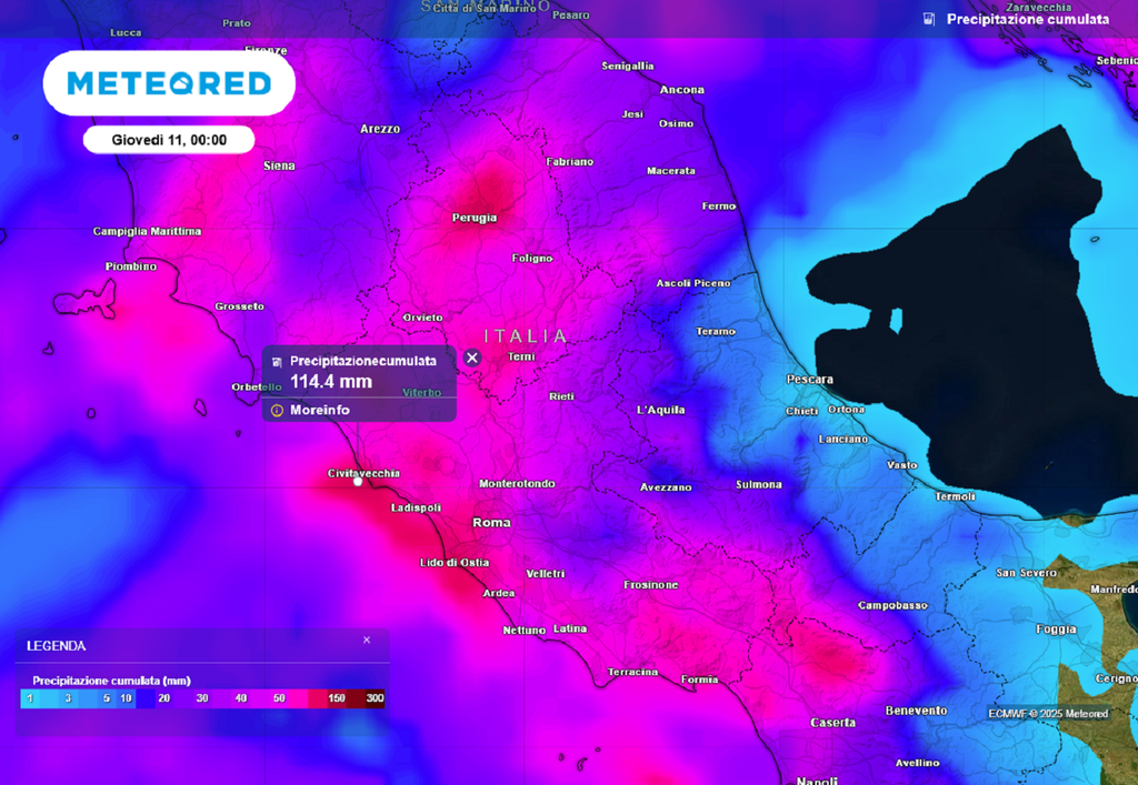 Accumuli superiori ai 50-60 mm sono previsti oggi anche in molte altre aree del centro, come l'Umbria, la Toscana, e la Campania settentrionale.