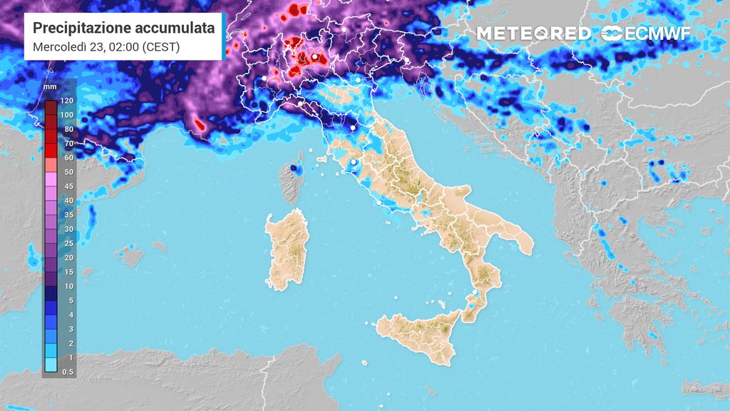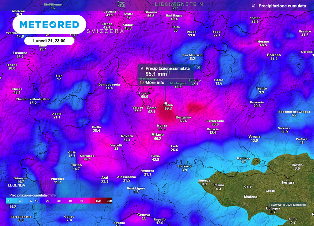 Attenzione in particolare in Lombardia, dove il nostro modello prevede accumuli fino a 100 mm nell'area al nord di Milano, tra le province di Lecco e Bergamo.