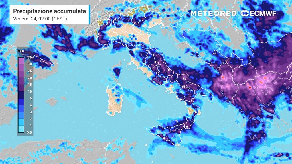 Stavolta il rischio di temporali pomeridiani sarà più alto sui rilievi e zone pedemontane, fra Basilicata, Calabria e Sicilia, e in misura minore pure sui monti più interne fra Campania e Basilicata. Localmente i fenomeni potranno risultare pure di moderata intensità.