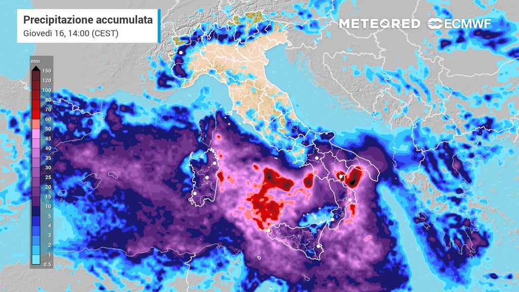 Le aree più a rischio per accumuli estremi sono alcune porzioni della Sicilia meridionale e orientale, e la Calabria centro-meridionale, specie il settore ionico, dove la stazionarietà di questi temporali potrebbe accrescere il prodotto pluviometrico.