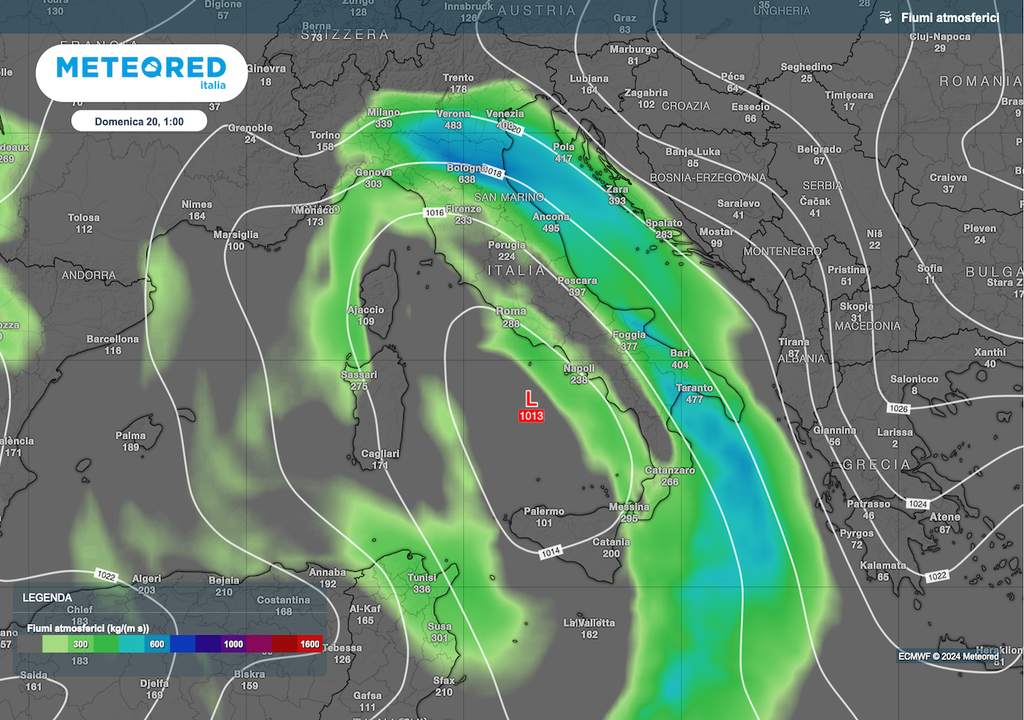 Ne abbiamo già parlato, a seconda della posizione e conformazione della depressione, cambiano le zone più colpite dai fenomeni estremi. Quella in corso vede alle ore 06 di sabato 19-10-2024 un minimo non particolarmente profondo, 1013 hPa, attorno all’isola di Ustica, previsto in spostamento a nord, presso le isole pontine, in serata.