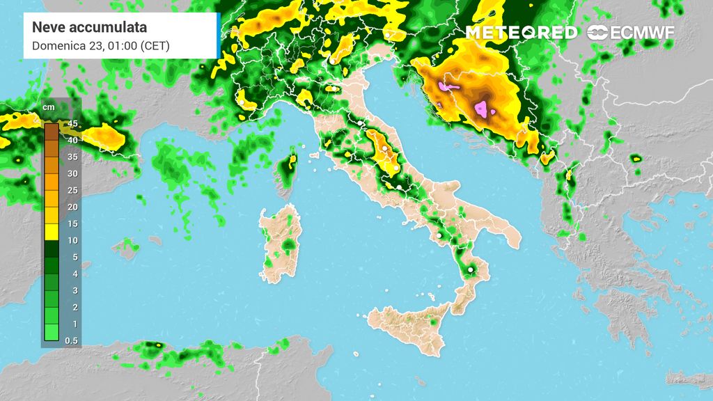 Anche in questo caso l’instabilità atmosferica viaggerà a braccetto con l’arrivo di aria estremamente gelida e questo porterà ad un crollo della quota neve anche sull’Appennino, dove le nevicate si attesteranno prevalentemente tra i 300 e i 1.000 metri.