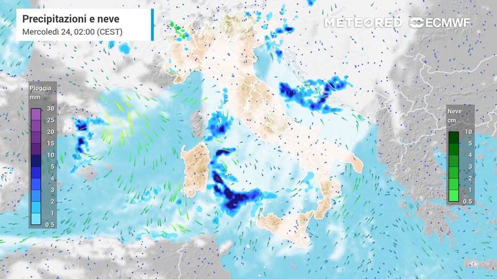Domani poi le piogge raggiungeranno anche le zone interne tra Puglia e Basilicata, nonché Sicilia occidentale e settentrionale. Sulle regioni del Centro-Nord, Sardegna compresa, saranno possibili ancora rovesci alternati a schiarite mentre sulle pedemontane delle Alpi ancora i venti meridionali addosseranno piogge puntualmente abbondanti.