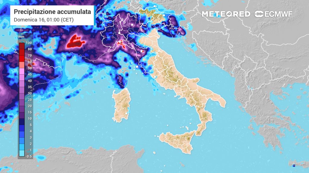 Sul resto del Nord e sull'Alta Toscana, in genere saranno probabili 20–40 mm di pioggia, con valori anche maggiori su Prealpi e Appennino (Alta Toscana - anche fino a 100 mm), minori invece sulle pianure orientali e sulla Romagna.