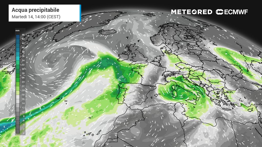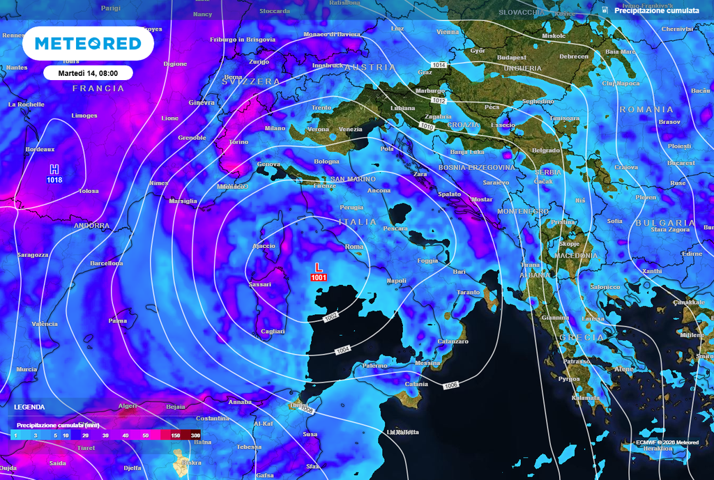 Il passaggio chiave avverrà tra la fine della domenica e la giornata di lunedì, quando l’arrivo di correnti più fresche dal Nord Europa e un vortice in risalita dal Nord Africa favoriranno la formazione di una circolazione depressionaria sul Mediterraneo.