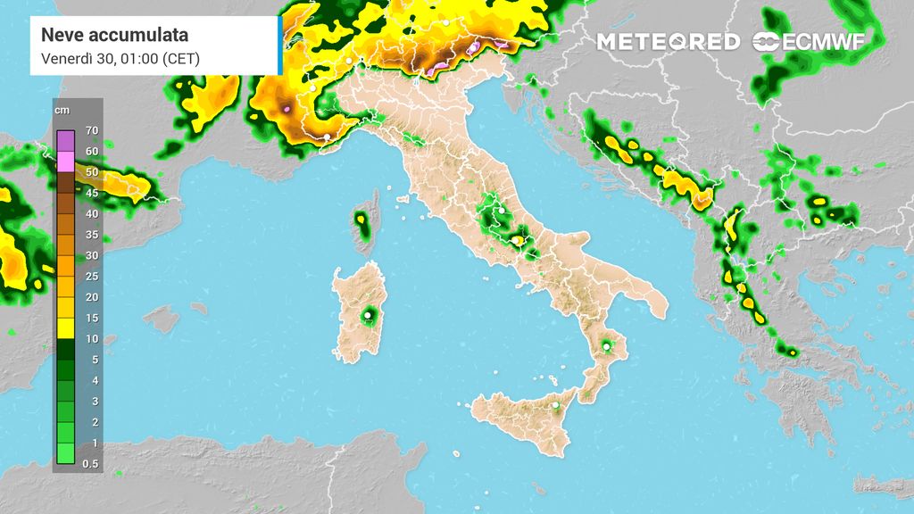 Il nostro modello di riferimento, l'europeo ECMWF, conferma che si tratterà di un evento significativo, con nevicate che si spingeranno a quote anche basse, specialmente sui settori meridionali della regione Piemonte.