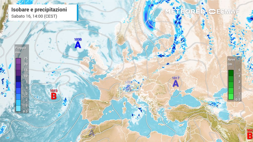L’anticiclone dà segni di invecchiamento e di cambiamento di struttura. Al suolo il massimo principale ora è in spostamento sul medio Atlantico e isole britanniche, in quota la cupola di origine subtropicale africana si indebolisce e lascia spazio a leggere infiltrazioni di aria instabile e a blanda circolazione ciclonica.