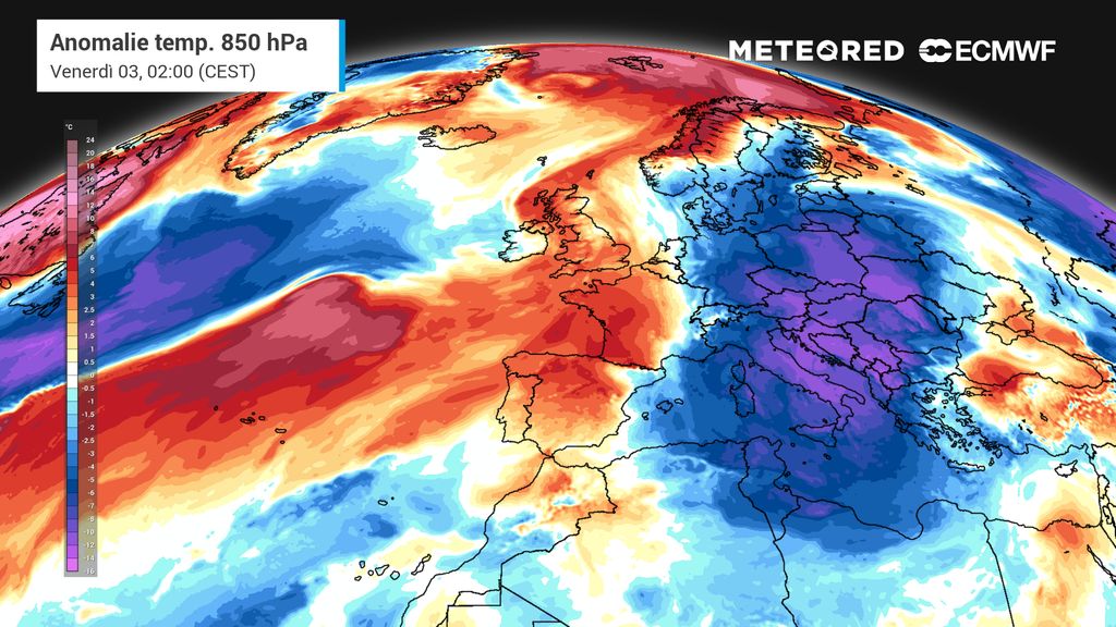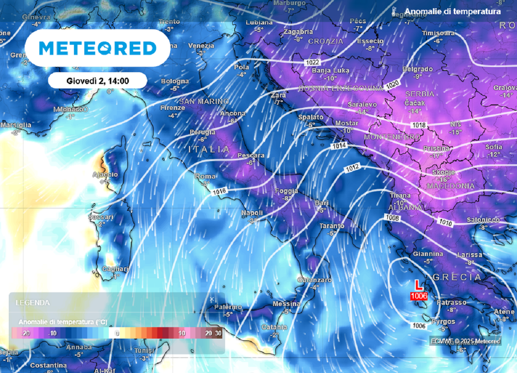 Le temperature quindi si porteranno al di sotto della media climatologica calcolata dal 1991 al 2020 in quasi tutta l’Italia, con punte anche oltre 10 °C al di sotto della norma.
