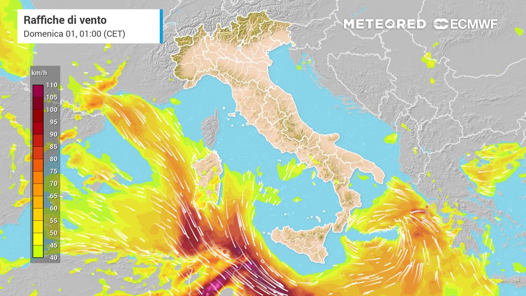 L’elemento meteorologico più significativo di questo evento sarà senza dubbio il vento. Il rapido spostamento del minimo dalla Sardegna verso il mar Ionio genererà raffiche molto forti, con punte localmente superiori ai 100 km/h, soprattutto in prossimità delle isole maggiori, lungo lo Stretto di Sicilia e sulle coste ioniche.