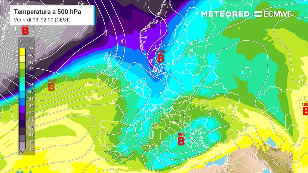 Da un lato, sulla parte occidentale del continente, tra la Penisola Iberica e la Francia, si è stabilizzato un robusto promontorio di alta pressione di matrice oceanica. Dall'altro, sul comparto balcanico e sull'Europa orientale, agisce una vasta area depressionaria colma di aria fredda di origine polare-marittima.