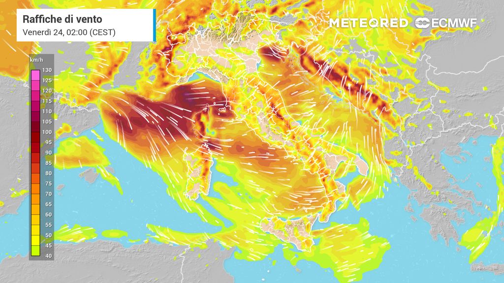 Su rilievi e crinali sono attese le velocità maggiori, con punte prossime a 55–60 km/h soprattutto tra tardo pomeriggio e tarda sera.