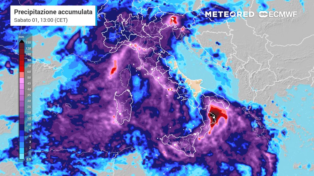 Sul versante ionico calabrese, in particolare tra Reggino, Catanzarese e Crotonese, sono attese precipitazioni molto intense con accumuli localmente superiori ai 110 millimetri in meno di 24 ore.