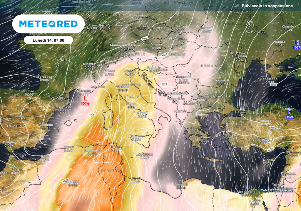Da segnalare anche fra domenica e lunedì un massiccio trasporto di pulviscolo dal deserto del Sahara, che renderà ovattato il sole dove presente e darà colorazioni strane alle nubi. Ne risentirà anche la qualità dell’aria, con incremento delle concentrazioni di PM10.