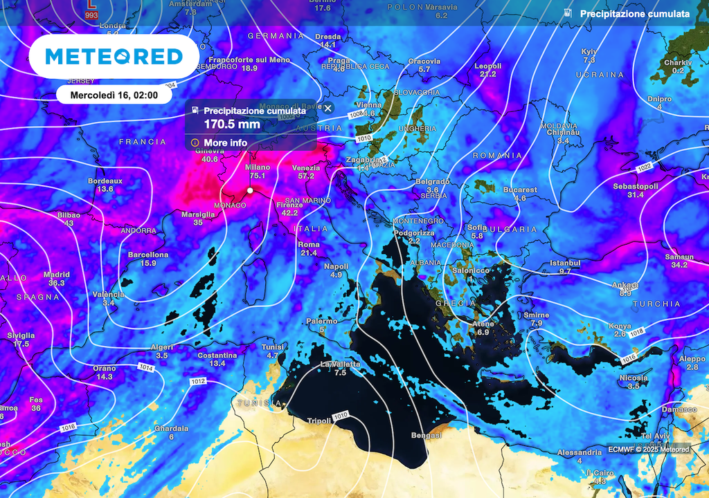 Inquadriamo ora in genere il periodo da lunedì a giovedì, senza scendere troppo nei dettagli che potrete leggere negli aggiornamenti di Meteored. Tanta pioggia cadrà specie sulla Liguria, nell’episodio come si nota dal nostro modello si potranno avvicinare i 170-180 mm, localmente anche 200 mm. Piogge frequenti su tutto il nord, in genere le perturbazioni per fortuna transitano veloci e si avranno pause di variabilità ma si accentua così la saturazione del suolo.
