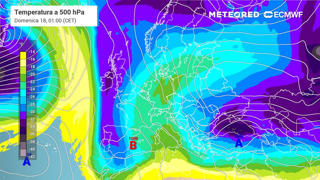 Tutto inizia poco a ovest della Scozia, dove la corrente a getto polare, in uscita dagli Stati Uniti, incontra un robusto anticiclone di blocco sulla Scandinavia, con massimi di geopotenziale sul Baltico.