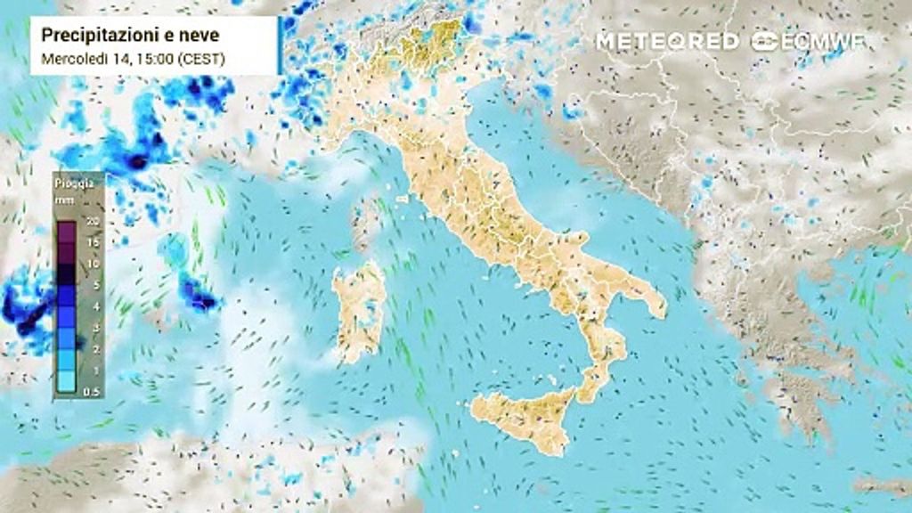 Nel pomeriggio è prevista una fase acuta di maltempo su alta Toscana, Levante ligure e Appennino emiliano con pioggia e temporali violenti. Sul resto del Centro e al Nord si prevedono molte nubi con piogge e temporali sparsi, mentre in Sardegna giungerà il Maestrale che porterà un ulteriore calo delle temperature, ma un miglioramento delle condizioni del tempo.