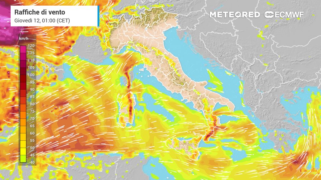 Questi dopo aver spazzato la Sardegna, si propagheranno fino al Canale di Sicilia e al medio-basso Tirreno, con forti venti da ovest-nord/ovest e nord/ovest che potranno superare i 100 km/h sulle coste della Sicilia tirrenica, e dalla tarda serata pure sulla Calabria tirrenica.