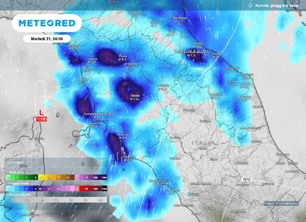 Nel corso della mattinata di martedì 21 le piogge cadranno con maggior insistenza sul litorale laziale, con possibilità di 20 mm di accumulo nell'area di Civitavecchia. Attenzione alla possibilità di piogge intense proprio tra bassa Toscana e alto Lazio, lungo il settore tirrenico.