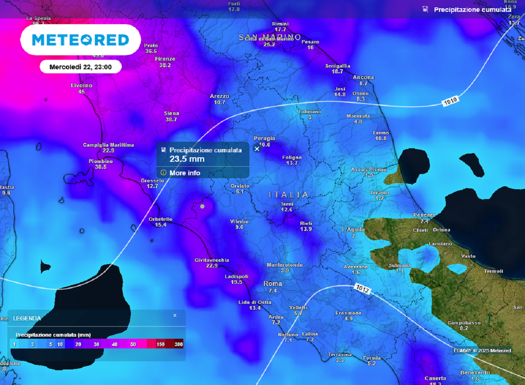 Per mercoledì 22 ottobre si prevede che la perturbazione scivoli ulteriormente verso Sud, e continui anche a portare un po' di instabilità sulle regioni settentrionali e centrali. La maggior parte delle piogge si concentrerà lungo il Tirreno, tra Campania e Calabria.