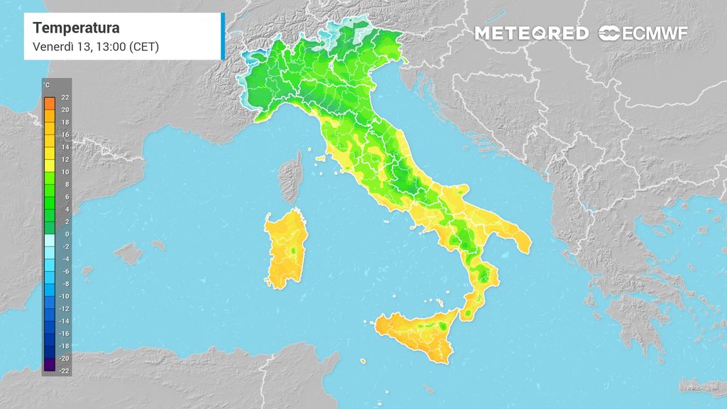 Sulle regioni settentrionali si verificheranno gelate diffuse, su buona parte della Val Padana. Gelate anche su valli e conche interne di Alpi e Appennino. Il calo termico entro lunedì 16 dicembre si estenderà anche all’estremo Sud, dove le temperature si spingeranno su valori al di sotto delle medie del periodo.