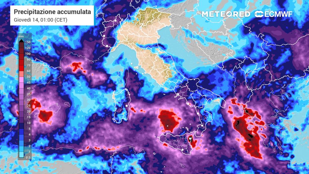 I modelli di riferimento di Meteored vedono un nucleo di bassa pressione scivolare sul bordo destro dell’anticiclone posizionato sull’Atlantico, per dirigersi verso l’Europa Centrale e rinvigorire l’altro nucleo di bassa pressione presente ormai da giorni tra Balcani e Grecia, responsabile delle piogge sulle nostre Isole Maggiori e dei nubifragi nel catanese.