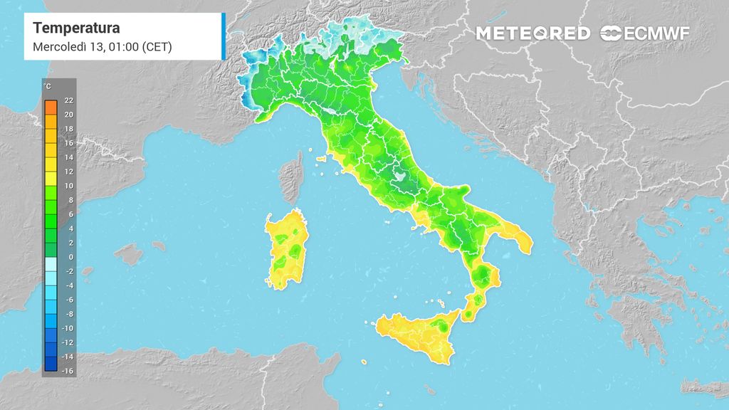 Minime al primo mattino tra 4 e 7°C al Nord, tra 6 e 10°C su pianure e coste del Centro, tra 10 e 14°C al Sud, fino a 16°C sulle coste siciliane.T