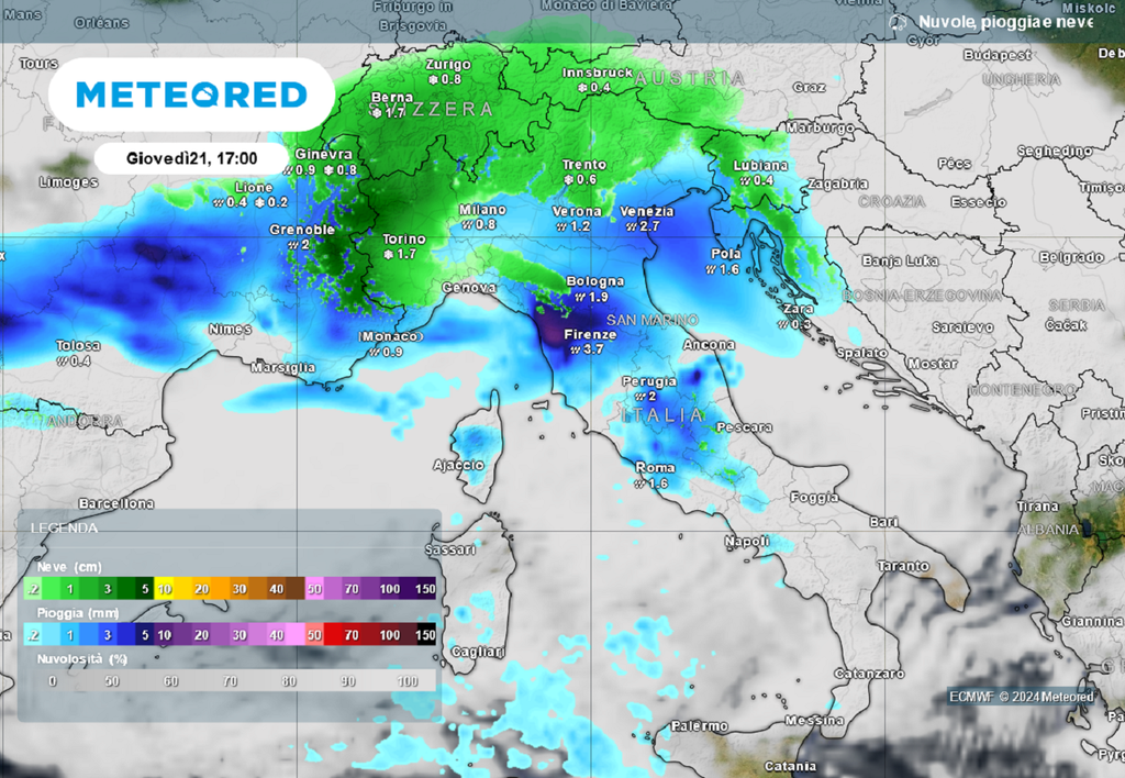 In giornata piogge e temporali si estenderebbero al resto delle regioni centro-settentrionali, con neve in estensione ali altri settori alpini, anche quelli orientali e quote neve molto basse, anche intorno ai 150 metri a ridosso delle pedemontane.