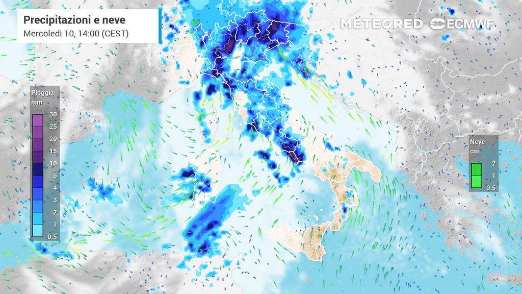 Nella notte su mercoledì 10 attese piogge anche su Campania e Sicilia settentrionale, e durante la giornata è atteso poi il passaggio del fronte, che porterà maltempo più organizzato sulle stesse regioni interessate dai fenomeni prefrontali.