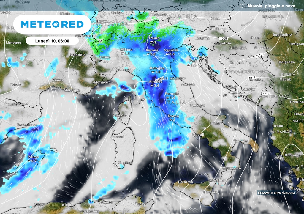 Lunedì piogge e temporali transitano al nord e al centro, per fortuna abbastanza veloci ma in qualche caso anche forti. Al nordest ed Emilia Romagna a tratti piogge diffuse autunnali, al nordovest invece primi diradamenti. La neve resta relegata ai passi alpini e a malapena alle cime più alte dell’Appennino, ovvero oltre 1800-2000 m.