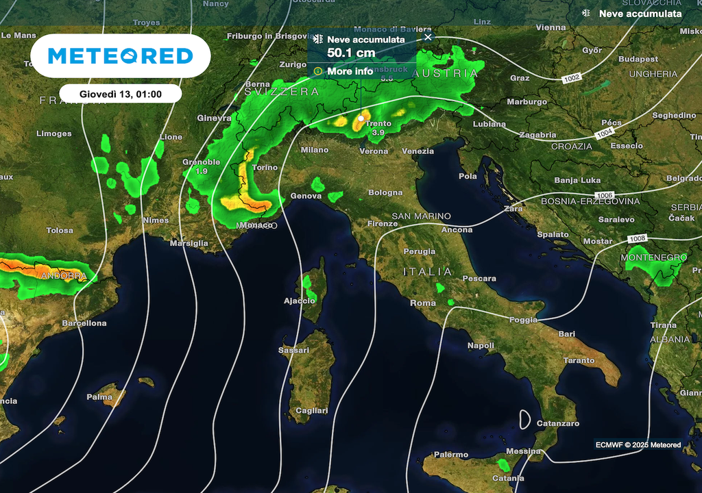In questo episodio le zone alpine oltre i 2200-2400 m riceveranno neve anche abbondante, ma bagnata primaverile: saranno condizioni critiche, sconsigliate per la pratica di scialpinismo, ma seguite i bollettini nivometeo regionali per i dettagli.