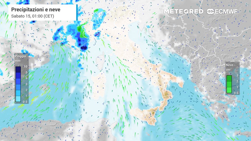 L’ingresso di aria più fredda favorirà il ritorno della neve sui rilievi. Sulle Alpi i fiocchi sono previsti attorno ai 1800–2000 metri, con accumuli maggiori sui settori occidentali e centrali (Valle d’Aosta, alto Piemonte, Valtellina e Alto Adige)
