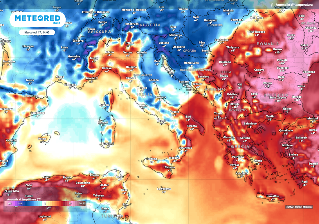 Mercoledì al nordovest ombra pluviometrica, in parte anche föhn da nord, al nordest inclusa gran parte Emilia Romagna e marginalmente Lombardia orientale, piogge, temporali e netto calo della temperatura.