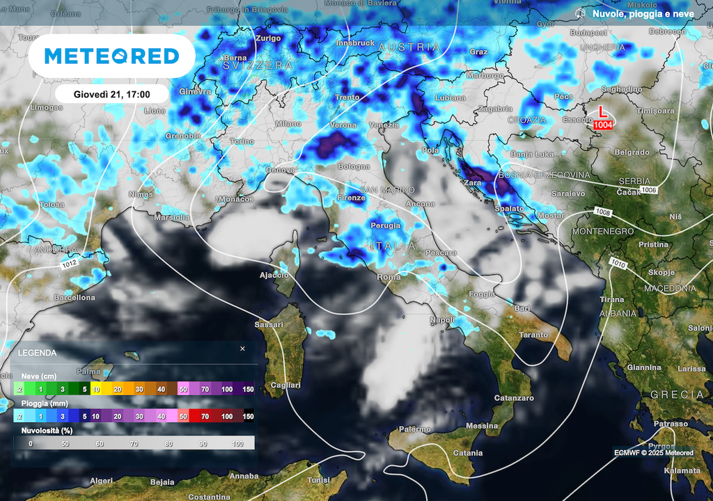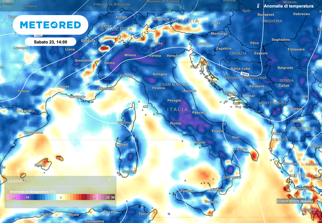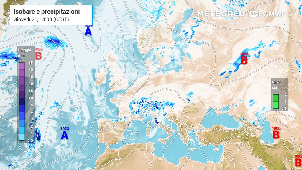 Al suolo un anticiclone di derivazione azzorriana si struttura con un promontorio dal medio Atlantico alla Groenlandia, mentre sull’Italia si forma un canale depressionario esteso da Mediterraneo alla Finlandia, con minimi complessi lungo la penisola.