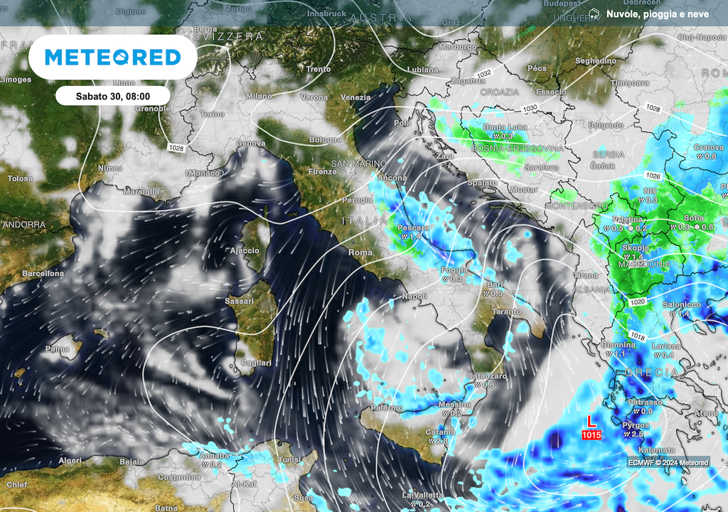 Una depressione associata a goccia di aria fredda in quota si trova ora fra il Mar Jonio e il Canale di Otranto, e si allontana gradualmente verso la Grecia. Questo sistema influenza ancora in modo residuo il centro sud, specie nel settore Adriatico e Sicilia orientale. Al nord invece domina un campo di alta pressione, ora con massimo sulla Germania quindi nelle prossime 36-48 in spostamento verso l’Europa orientale. Porterà aria modestamente fredda, ben lontana da essere definitiva vera irruzione.