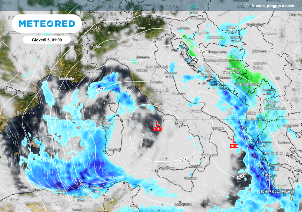 Mercoledì nubi più dense transitano un po’ in tutt’Italia, al nord per l’avvicinarsi della citata debole perturbazione, al centro sud per una possibile depressione sul basso Tirreno. Piogge irregolari e qualche rovescio raggiunge così le regioni centrali, ancora poco localizzabili in dettaglio, e marginalmente quelle meridionali.