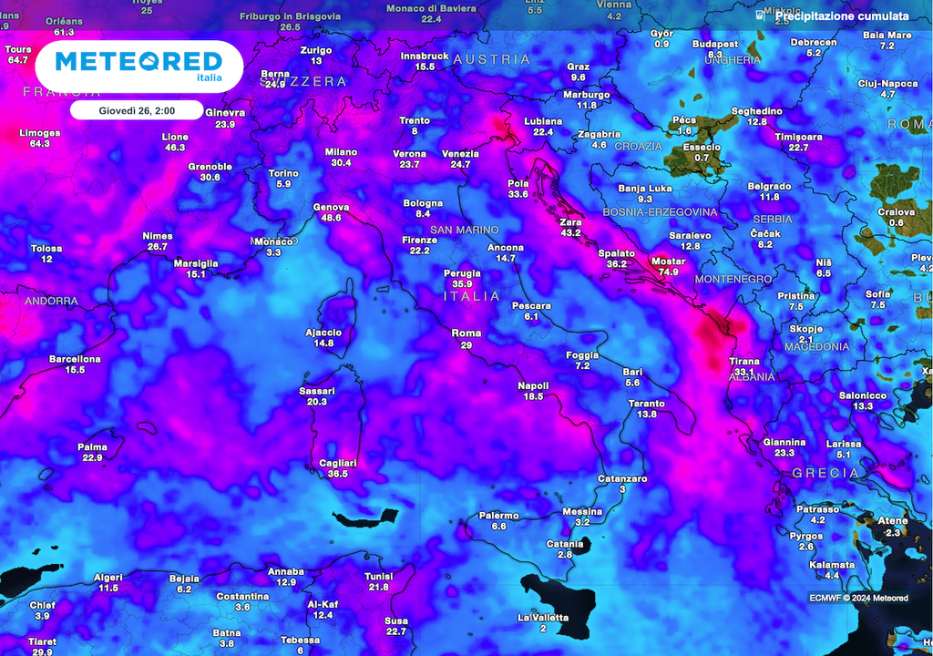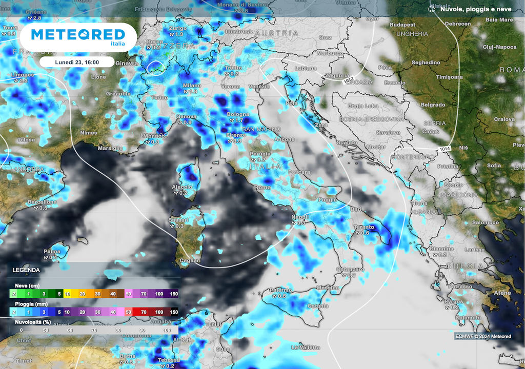 Al centro i rovesci interesseranno la Toscana, soprattutto nella parte settentrionale; variabilità perturbata nelle altre regioni, con qualche pioggia ma anche zone di diradamento. Variabile anche in Sardegna. Al sud occasione per rovesci temporaleschi nel pomeriggio fra Campania, Basilicata Tirrenica e Calabria.