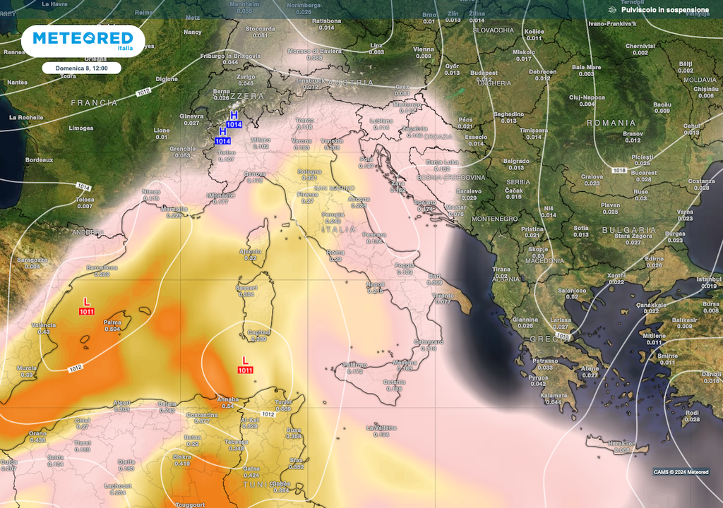 Al sud resta tempo abbastanza buono anche se velato per nubi medio alte e polvere sabbia desertica in sospensione.