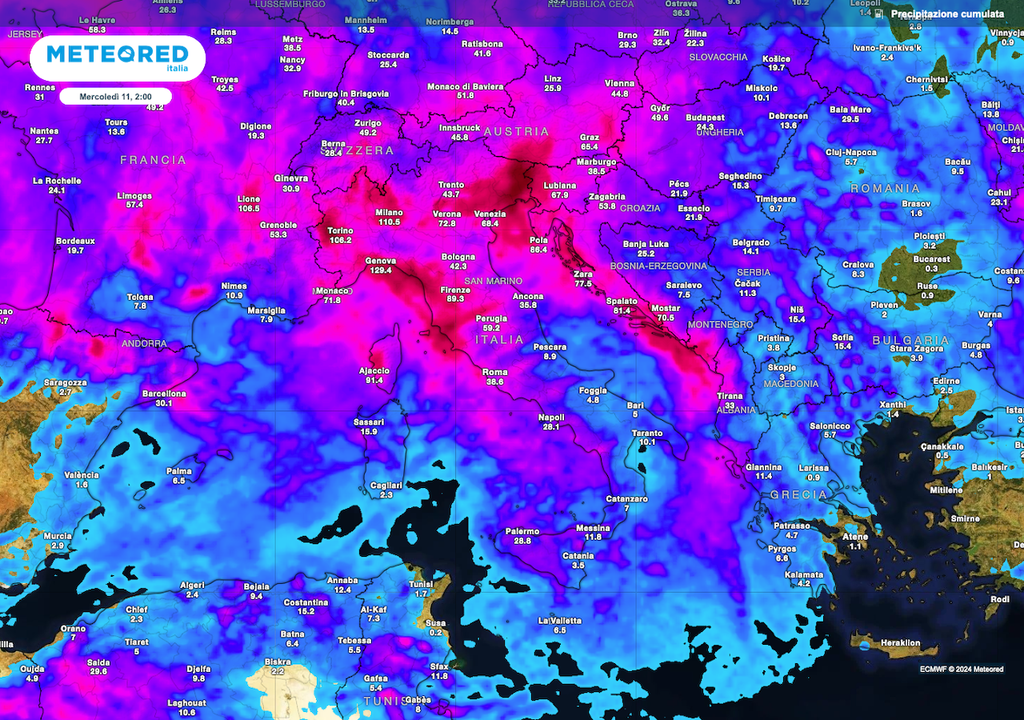 Martedì un nuovo impulso freddo porterà piogge anche diffuse e più continue autunnali al nord, con marcata rinfrescata. Prima nevicata autunnale sui ghiacciai oltre i 3000 m, possibile imbiancata anche dei passi più alti come lo Stelvio.