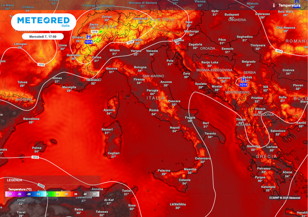 Dicevamo della risalita termica, permangono notti tropicali nelle città, con minime sui 20-22°C, 18-20°C nelle campagne del centro nord, 22-24°C in quelle del sud. Massime che si riportano verso i 33-35°C, ma quanto meno anche al centro sud non dovremmo avere valori estremi.