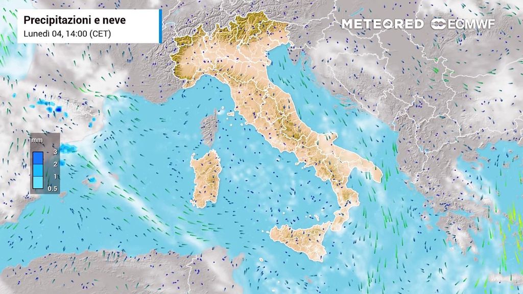 Per mercoledì le velature si saranno fatte più spesse, specie al Centro-Nord, e la probabilità di piovaschi si estende a tutta la Sicilia e alla Calabria ionica.