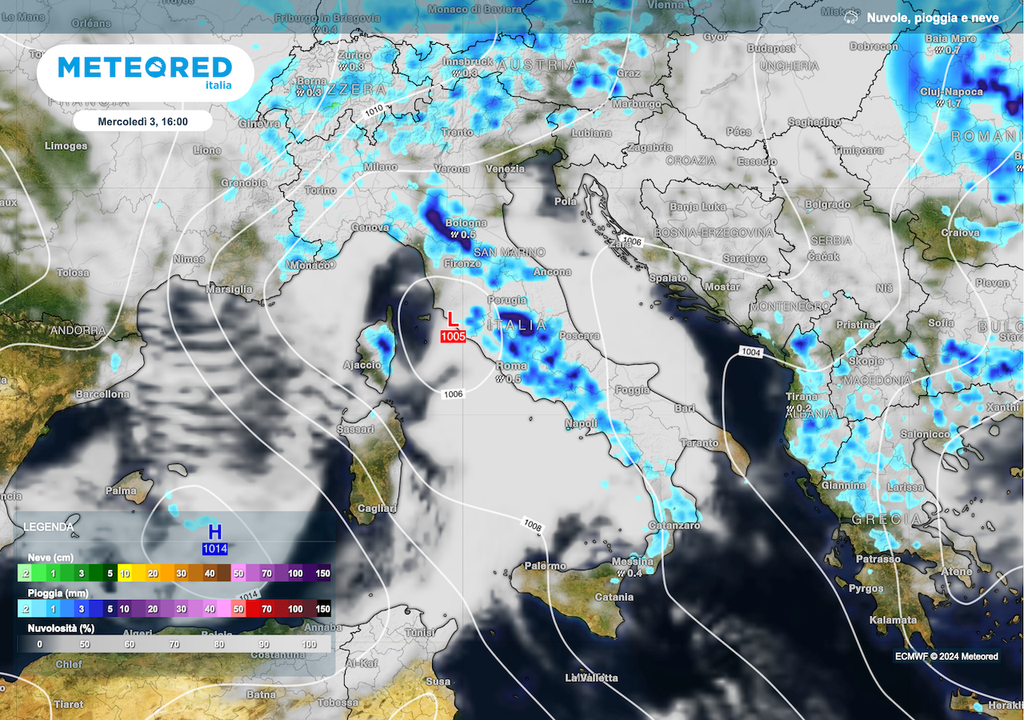 Mercoledì pomeriggio dopo una breve tregua si formano di nuovo temporali al nordest per instabilità residua mentre al centro si riorganizzano temporali frontali segnatamente fra interno del Lazio, alta Campania, Abruzzo e Molise. Qualche rovescio temporalesco raggiungerà anche le coste tirreniche meridionali, specie di Calabria, lambendo la Sicilia orientale.