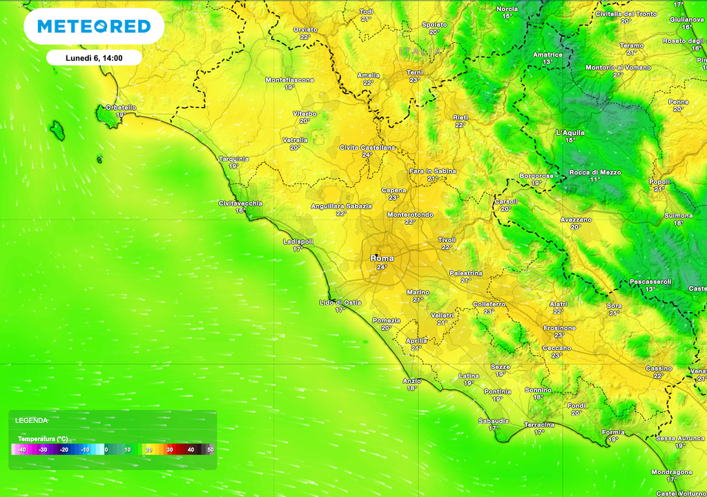 Le temperature saliranno ulteriormente, con punte fino a 24°C a Roma e circa 20°C a Latina. Sul litorale il clima sarà leggermente più fresco, complice la temperatura ancora bassa del mare.