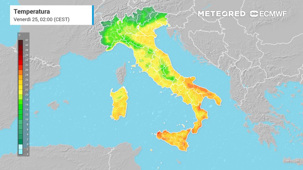 Sabato 26 luglio si prevede ancora caldo al centro d’Italia con temperature massime prossime ai 30 °C, ma possibili velature del cielo su Toscana, Umbria e Marche, mentre al Sud è previsto un primo calo delle temperature grazie all’arrivo del Maestrale in serata sulla Sicilia.